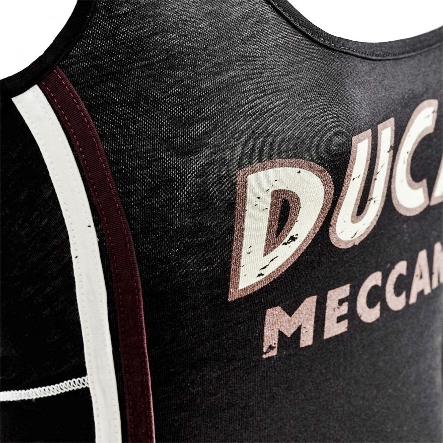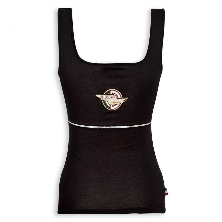 Also in summer, the Ducati goes with fashion style! With the sleeveless shirt Meccanica, every woman can express her passion for Ducati with a comfortable and versatile piece of clothing. The shirt is available in black and vintage red. It carries on the front the traditional lettering in plastisol print, which makes it even clearer and more radiant, while on the back in the neck area is the famous logo with the typical "wings" of the fifties.
